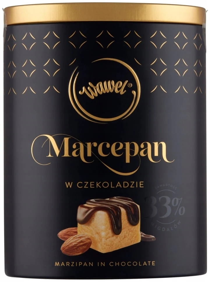 Bombonierka Wawel Marcepan 200 g (puszka) to klasyczne praliny z nadzieniem marcepanowym, oblane czekoladą, zapakowane w dekoracyjną metalową puszkę. Profil wyraźnie migdałowy, słodki i tradycyjny – dla osób, które lubią marcepan bez udziwnień.