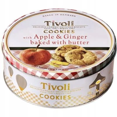 Przepyszne duńskie ciasteczka Tivoli z dodatkiem jabłka i imbiru. Zapakowane w elegancką, metalową puszkę. Idealne na prezent.