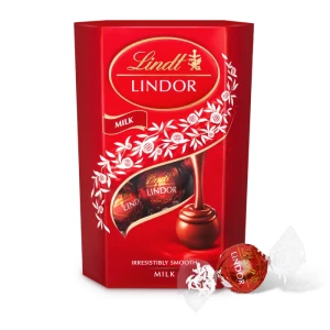 Pralinki szwajcarskiej firmy Lindor w eleganckim opakowaniu – mleczne czekoladeki w formie kuleczek z delikatnie rozpływającym się wnętrzem z najlepszej czekolady.