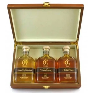 Zestaw zawiera 3 włoskie grappy w butelkach o pojemności 200ml, pochodzące z destylarni Marzadro w północnych Włoszech. Całość zapakowana jest w drewniane, bardzo elegancko wyglądające pudełko.