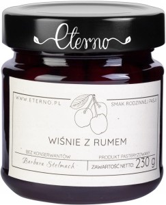 Słoiczek domowych wiśni doprawionych pysznym, rozgrzewającym rumem. Polska marka Eterno przygotowała konfitury, które najlepiej smakują po kilku miesiącach leżakowania. Produkowane są bez dodatku konserwantów, a tylko z niewielką ilością cukru dla lepszego efektu. Konfitury zawierają 1,2% objętości alkoholu.