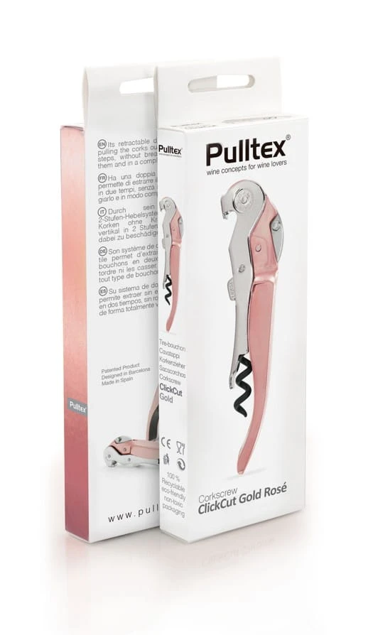 Trybuszon ClickCut w wersji kolorystycznej Rose Gold to w pełni profesjonalny, hiszpański korkociąg niezbędny w akcesorium każdego sommeliera. Powstaje wyłącznie z najwyższej jakości materiałów, wyróżniających się trwałością i niezawodnością- jego ząbkowane ostrze wykonano ze stali nierdzewnej, spiralę ze stali węglowej pokrytej teflonem, dźwignię ze stali niklowanej zaś rączkę z żelaza. Podwójna dźwignia łatwo i szybko pozwala na otworzenie butelki wina zabezpieczając korek przed złamaniem. Trybuszon ClickCut uznano za najlepszy w swojej kategorii w konkursie profesjonalnych akcesoriów winiarskich na targach w Gevrey-Chambertin we Francji. Trybuszon ClickCut Rose Gold wyróżnia się również eleganckim wyglądem a tekturowe opakowanie sprawia, że jest idealnym kandydatem na upominek dla miłośnika wina.
