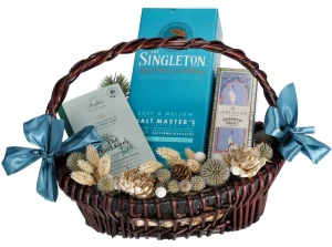 Skąpany w błękicie wiklinowy kosz delikatesowy, którego serce stanowi znakomita szkocka whisky.