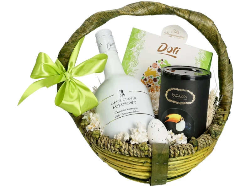 Kompozycja w zielonej wiklinie z wielkanocnym akcentem. Niebanalny zestaw draży w czekoladzie, aromatycznej kawy wraz z delikatnym likierem tworzą wyśmienite trio, któremu nie sposób się oprzeć.