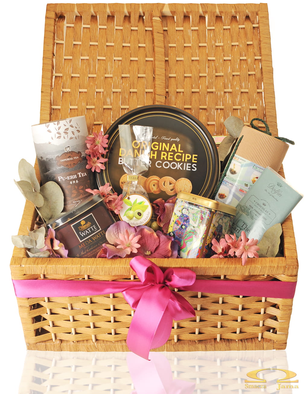 Upominek obok którego nie przejdzie obojętnie żaden miłośnik herbacianych naparów. Tuż obok wysokogatunkowej czarnej herbaty Dilmah można znaleźć elegancką tubę z dziesięcioma rozkwitającymi pąkami kwiatów, które uwalniają swój wyjątkowy smak tuż po zalaniu ciepłą wodą. Ten rattanowy kosz ozdobiony różanymi dekoracjami to także sporo słodkości - czekoladowe kulki z najlepszą, japońską matchą, czekolada Dolfin z herbatą Earl Grey, czy tradycyjne, maślane ciasteczka, które pasują do każdej prezentowanej tutaj mieszanki. Polecamy szczególnie z okazji Dnia Kobiet, Dnia Mamy, czy każdej innej, ważnej okazji.