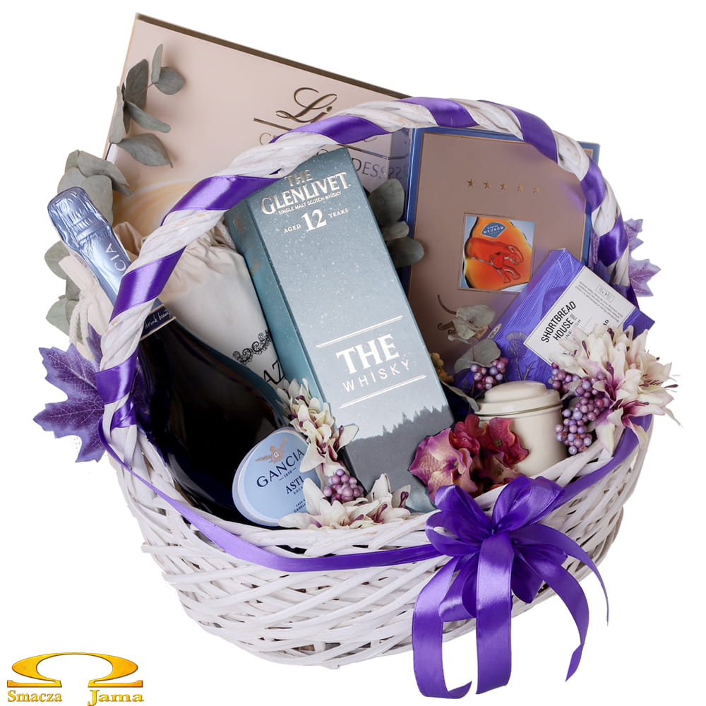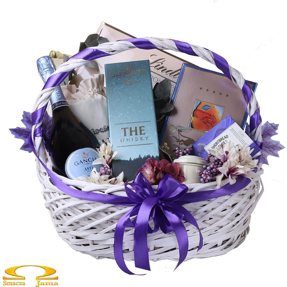"Przy tobiem był. Z twych ócz lazuru / Wszechzapomnienia piłem zdrój" - powiada się w wierszu Goethego "Powitanie i rozłąka". A dalej jest już tylko piękniej. W koszu zainspirowanym wyobraźnią poety znajdziemy genialne słodycze, kawy i alkohole, które są niczym szczere słowa wdzięczności, miłości i przywiązania: szkocką whisky, francuski koniak, włoskie wino musujące, szwajcarskie praliny, kilka puszek świeżo palonej kawy... Czy można chcieć więcej? Całość utrzymana w eleganckich barwach lazuru, fioletu, bieli i srebra.