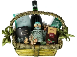 Oferowane przez nas kosze są zabezpieczane finalnie grubym celofanem oraz przyozdabiane wstążkami/rafią.