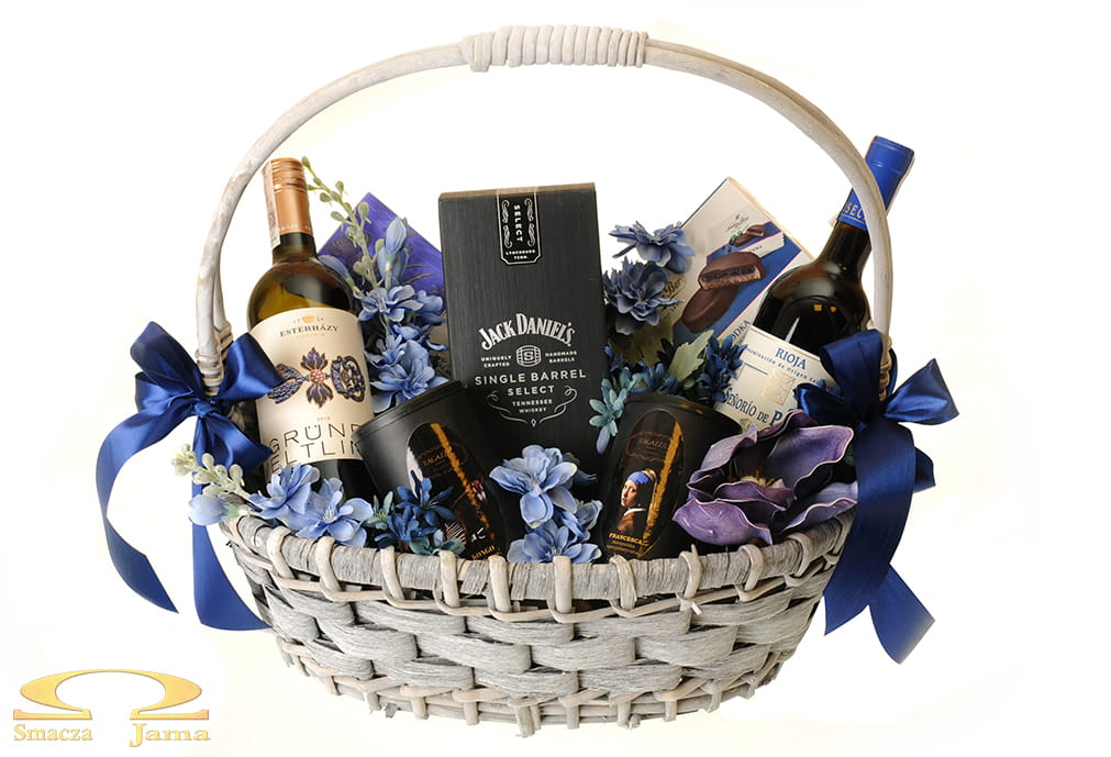 Doskonała propozycja kosza delikatesowego na uroczystość ślubną - dla Młodej Pary oraz, przez wzgląd na podwojone sugestie kaw i wina, także dla rodziców jako podziękowanie w tym wyjątkowym dniu. Kosz Nocny Król to zestawienie chłodnych tonacji - szarości, bieli i błękitów, skutkujące niezwykle eleganckim efektem. Sercem tego zestawu jest wyjątkowa edycja Jack'a Danielsa z pojedynczej beczki, prezentowana w gustownym kartoniku imitującym drewno. Do pełnego obrazu tego szczególnego prezentu dodano także dwie bombonierki słodkości, których marki potwierdzają najwyższą jakość.