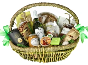 Bogata kompozycja smakowa umieszczona w zielonym koszu z wikliny dedykowana jest wszystkim miłośnikom wiosny.
