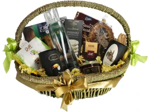 Wielkanocny koszyk obfitości, skomponowany wyłącznie z polskich produktów, z krystalicznie czystą wódką, słodkimi i wytrawnymi dodatkami. Wiosenna herbata, owocowe słodycze, konfitury z wiśniowej manufaktury przypadną do gustu również tym, którzy preferują mniej słodkie przekąski; wielbiciele tradycyjnych słodkości sięgną w pierwszej kolejności po wedlowskie baryłki oraz krakowski mazurek- ten kosz to uniwersalny świąteczny upominek!