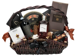 Luksusowe alkoholowe trio w towarzystwie unikatowych słodkości, aromatycznej kawy i herbaty - ten efektowny kosz to kompozycja, która gwarantuje zachwyt od pierwszego spojrzenia. Utrzymany w stonowanej kolorystyce z delikatnymi złotymi akcentami trafi w gust każdego, kto ceni sobie wykwintne i eleganckie doznania - zwłaszcza smakowe!