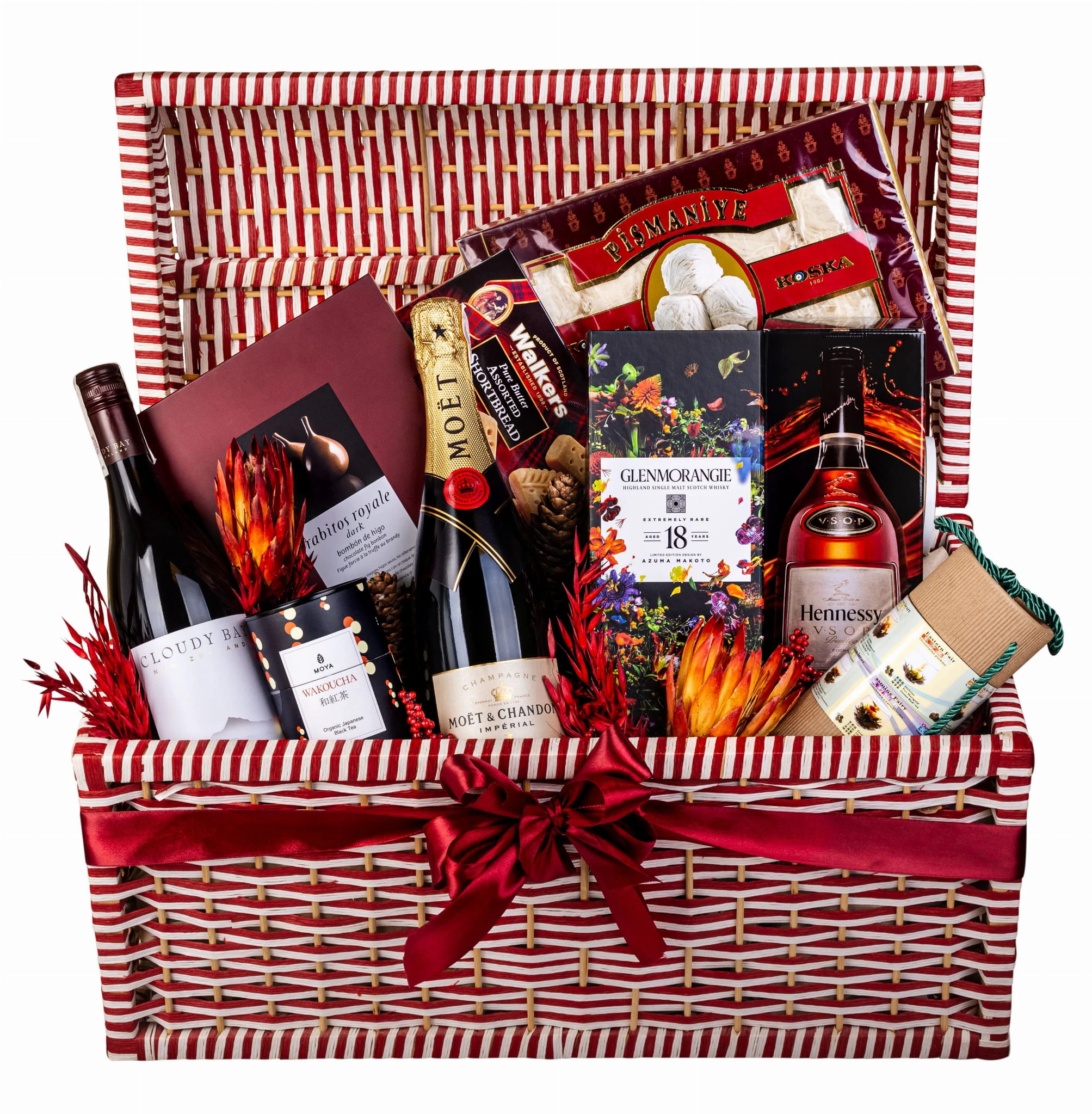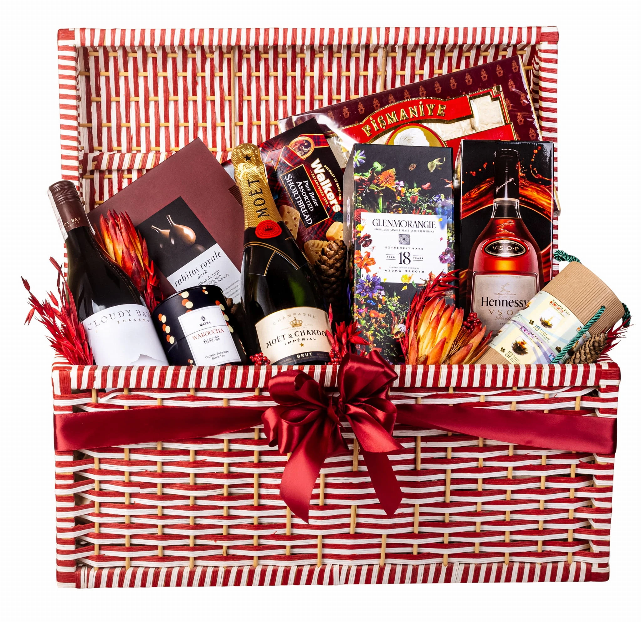 Wiklinowy kufer zawierający prestiżowe alkohole, luksusowe herbaty i słodkie dodatki. Imponująca kompozycja na wyjątkową okazję.