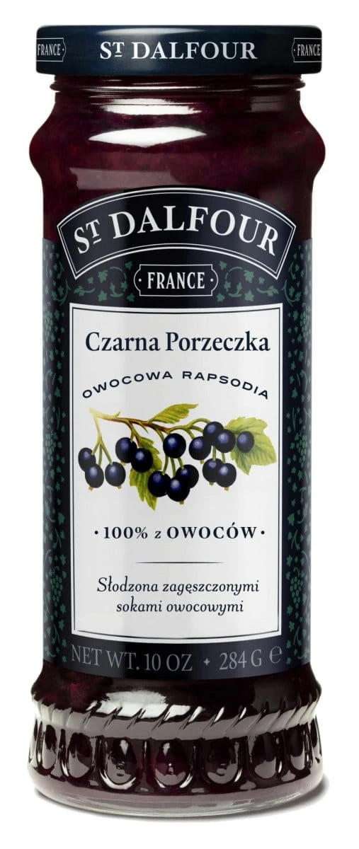 "Owocowa Rapsodia" firmy St. Dalfour o smaku czarnej porzeczki wytwarzana jest według tradycyjnej receptury, która swoją historię rozpoczęła w dolinie Loary. Konfitury te wytwarzane są wyłącznie z owoców a słodkości dodaje im naturalny sok z winogron. Waga netto: 284g