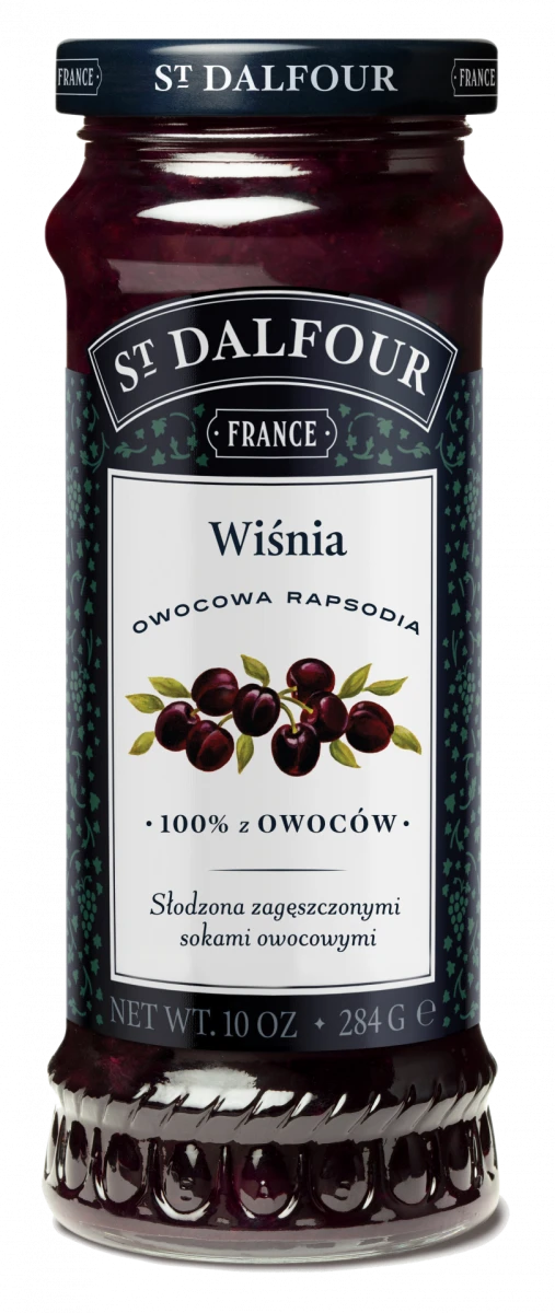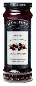 "Owocowa Rapsodia" firmy St. Dalfour o smaku wiśni wytwarzana jest według tradycyjnej receptury, która swoją historię rozpoczęła w dolinie Loary. Konfitury te wytwarzane są wyłącznie z owoców a słodkości dodaje im naturalny sok z winogron. Waga netto: 284g