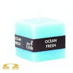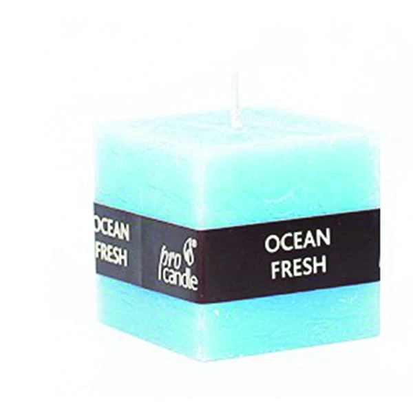 Świeca rustykalna o morskim zapachu w kształcie sześcianu.