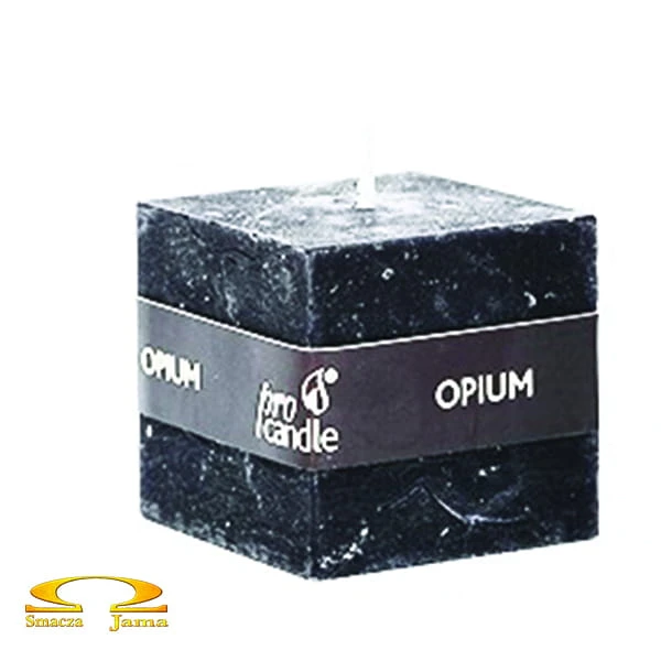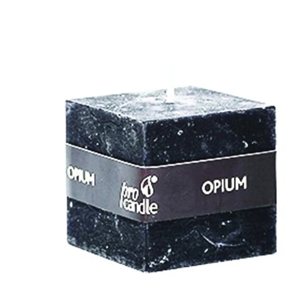 Świeca rustykalna o zapachu opium w kształcie sześcianu.