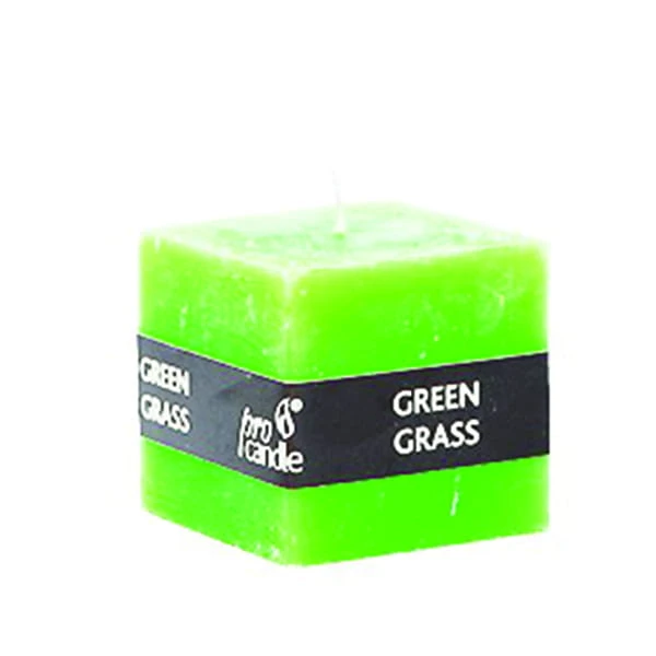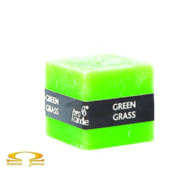 Świeca rustykalna o zapachu świeżej zielonej trawy w kształcie sześcianu.