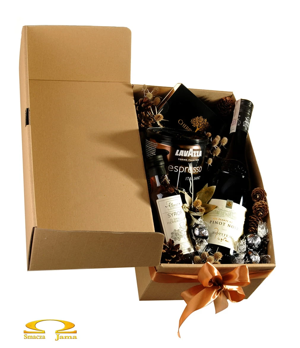 Świąteczny upominek w pudełku z ekologicznej karbowanej tektury, złożony z niebanalnych polskich produktów, zachwycających zarówno tradycyjnymi recepturami jak i naturalnym składem, w otoczeniu popularnej włoskiej kawy, szwajcarskich pralin i będącego marką samą w sobie francuskiego wina ze szczepu Pinot Noir.