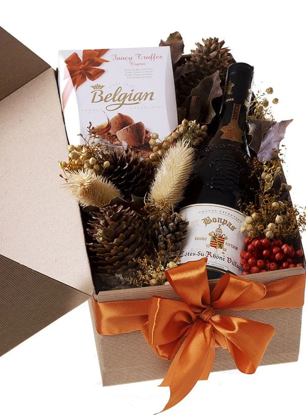 Duet idealny - dobre klasyczne czerwone wino oraz słodkie wykwintne trufle oblane kremową belgijską czekoladą. Całość