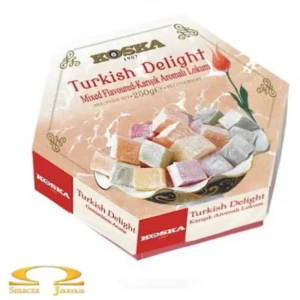 Rachatłukum Turkish Delight Koska 250 g to tradycyjny turecki deser o miękkiej, żelowej konsystencji, przygotowany na bazie cukru, skrobi i aromatów owocowych. Produkt wyróżnia się delikatnym smakiem, subtelną słodyczą i charakterystyczną konsystencją typową dla lokum.
