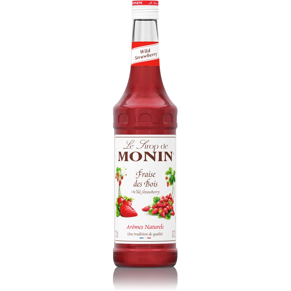 Syrop MONIN Wild Strawberry o intensywnie czerwonej barwie ze złotymi refleksami skrywa piękny, intensywny smak świeżych, dojrzałych poziomek, który idealnie pasuje do wódki lub wina tworząc aromatyczne, odświeżające koktajle z nutką dzikiej przyrody.