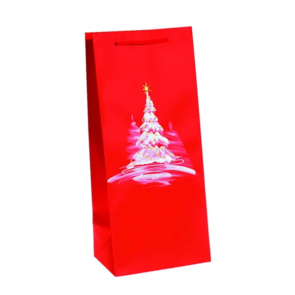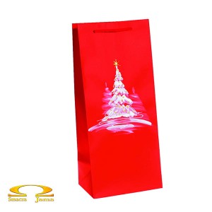 Świąteczna torebka prezentowa na butelkę wina, dekorowana ręcznie. Kolor czerwony z motywem ośnieżonej choinki. Papier matowy, sznureczek w kolorze czerwonym.