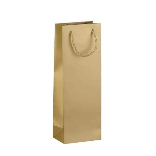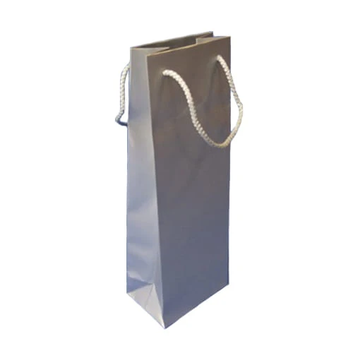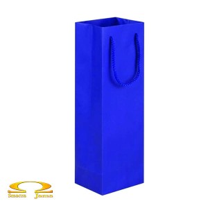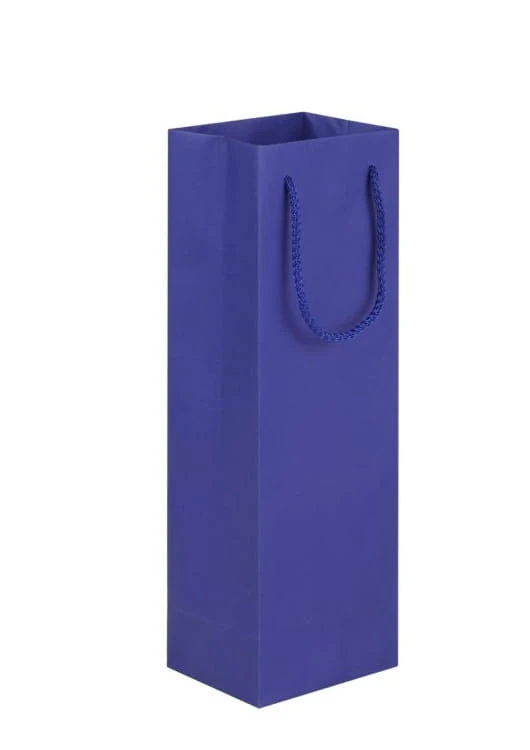 Torebka prezentowa na butelkę wina, jednolita kolorystycznie, wykonana z papieru, z rączką z plecionego sznurka. Dostępna w kilku wariantach kolorystycznych.