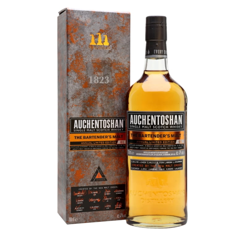 Auchentoshan Bartender's Malt to specjalna, limitowana seria popularnej whisky z gorzelni Auchentoshan - jedynej, która konsekwentnie stosuje proces trzykrotnej destylacji i która produkuje wyłącznie whiskies typu single malt, a od niedawna także blended malt. Stanowi kompozycję destylatów z pięciu różnych dekad, wyselekcjonowanych przez dwunastu uznanych barmanów z pięciu krajów. Zaproszono ich do gorzelni ze względu na nowatorskie, śmiałe i oryginalne podejście do świata drinków, z którego są znani, a następnie oddano wolną rękę w kwestii składu mieszanki. Znalazły się w niej whiskies bardzo różne: leżakowane w beczkach po bourbonie, sherry i czerwonym winie, w beczkach z dębu amerykańskiego i europejskiego. Najstarsza liczyła sobie kilkadziesiąt wiosen, najmłodsza zaś 6. Tak powstał blended malt na miarę XXI wieku. Butelkowany z mocą 47% alk. obj. Kolor: złoto-miedziany z zielonkawymi refleksami. Zapach: suszone morele, czekolada mleczna i miód, a także akcenty zielonych liści tytoniu. Smak: wyraźny i ekspansywny; na pierwszym planie kwiat wiśni i nuty świeżo pieczonej brioszki, w tle energii dodają akcenty skórki cytrusowej i imbiru. Finisz: rozgrzewający, pikantny i długi.