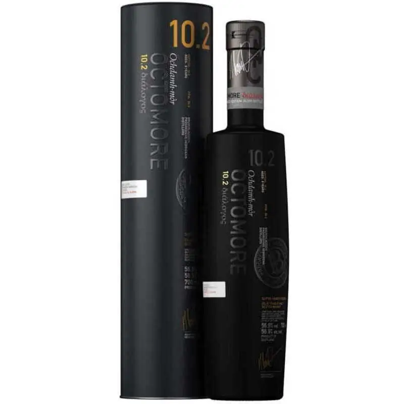 Octomore 10.2 charakteryzuje się aromatem opalanego dębu, dojrzałej nektarynki, soczystej marakui, cytryny w syropie oraz spowijającym całość torfowym dymem. W smaku niezwykle bogaty i wielowymiarowy, o lekko oleistej konsystencji, z niuansami słodkich owoców, brzoskwiniowej galaretki, suchego dymu i pewnej dębowej wytrawności. Klasyczna kompozycja słodko-dymnego Octomore z dodatkiem prażonego dębu. Finisz pozostawia na podniebieniu miodowe nuty z akcentami pomarańczy i goździków.