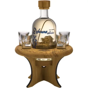 Podanie i oprawa dla najbardziej wymagających. Wódka Dębowa w zestawie ze stolikiem oraz 4 sygnowanymi nazwą firmy kieliszkami.