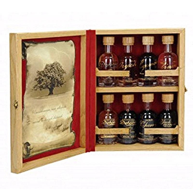 Miniaturki polskiej wódki smakowej. Apteczka Leśna to drewniana skrzynka z miniaturkami o pojemności 0,05l w ośmiu wyselekcjonowanych smakach: orzecha, czeremchy, śliwy, klasycznej Dębowej, miodu i koniaku, czarnej porzeczki, wiśni oraz kawy i migdałów.