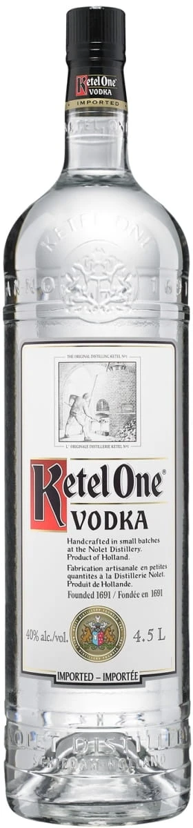 Wódka Ketel One 40% 4,5 l to wielkoformatowa wersja holenderskiej wódki premium, produkowanej w rodzinnej destylarni Nolet od końca XVII wieku. Powstaje z wyselekcjonowanej pszenicy i łączy nowoczesną kolumnową destylację z tradycyjną destylacją w miedzianych alembikach. Charakteryzuje się czystym, wyważonym profilem, cenionym szczególnie w profesjonalnej miksologii. Format 4,5 l przeznaczony jest do serwisu eventowego i gastronomii premium.