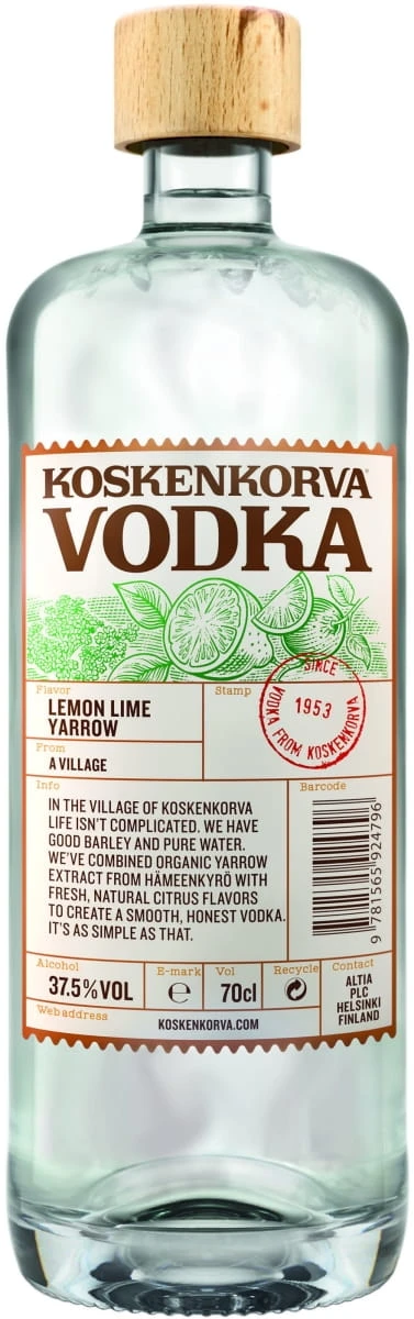 Wódka Koskenkorva Lemon Lime Yarrow 37,5% 0,7 l to fińska wódka smakowa, łącząca orzeźwiające nuty cytryny i limonki z delikatnym, ziołowym akcentem krwawnika (yarrow). Wyróżnia się świeżym, cytrusowo-ziołowym charakterem, który łączy soczystą kwasowość cytrusów z subtelną, roślinną świeżością. To lekka i bardzo uniwersalna propozycja do drinków.