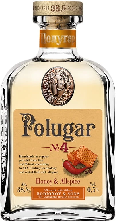 Wódka Polugar No 4 Honey & Allspice 38,5% 0,7 l to rzemieślnicza wódka smakowa inspirowana dawnymi staropolskimi recepturami nalewek i okowit. Łączy naturalną słodycz miodu z korzenną, lekko pikantną nutą ziela angielskiego, tworząc kompozycję wyrazistą, ale harmonijną. Produkowana w stylu nawiązującym do tradycyjnych metod, wyróżnia się bogatszą strukturą niż klasyczne wódki smakowe.