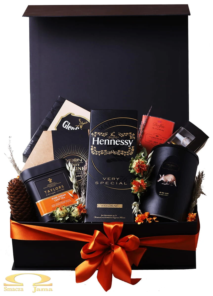 Przyciągający wzrok, energetyczny zestaw delikatesowych produktów klasy premium w eleganckim czarnym pudełku kontrastowo ozdobionym suszonymi roślinami. Kompozycję tworzą m.in. znakomity koniak, niebanalne tartinki, pełne miodowej słodyczy praliny, herbata ceniona przez brytyjskich koneserów- o wyjątkowości tych i reszty produktów warto się samemu przekonać albo zadedykować wyborne chwile zapomnienia Komuś Szczególnemu.