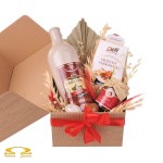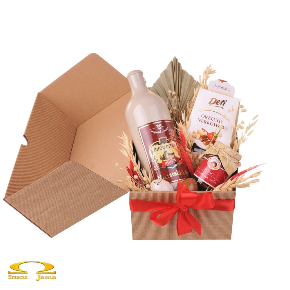 Miód, orzechy i migdały - to jasne, że musi być pysznie! Świetlista kompozycja w pudełku z naturalnej karbowanej tektury, udekorowana świątecznie, zawiera kamionkową butelkę miodu pitnego oraz słodkie dodatki.