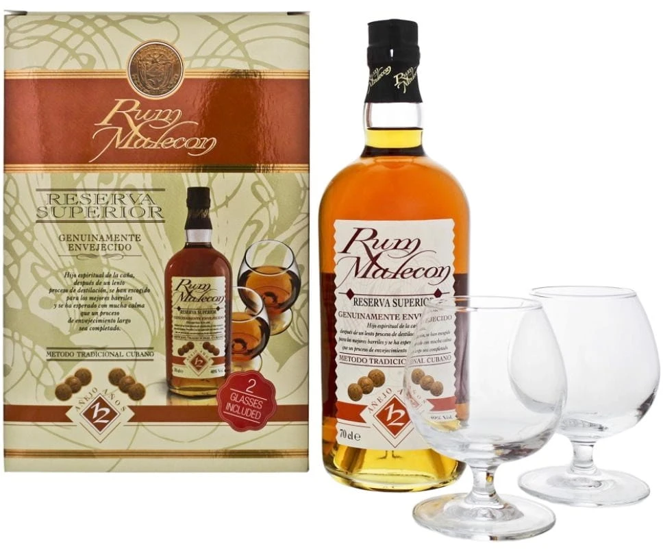 Zestaw rum Malecon 12 YO 40% 0,7l + dwie szklanki